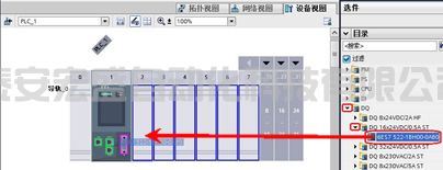 6.成功插入PLC后,STEP 7 Professional V12 軟件會(huì)自動(dòng)跳轉(zhuǎn)到設(shè)備視圖。接下來(lái)我們要做的是在主機(jī)架上依次插入一個(gè)16通道的數(shù)字量輸出擴(kuò)展模塊和一個(gè)數(shù)字量輸入擴(kuò)展模塊。首先,添加DQ模塊:在“設(shè)備視圖”右側(cè)的產(chǎn)品目錄中,依次點(diǎn)擊“DQ”、“DQ 16*24VDC/0.5A ST”左側(cè)的小箭頭展開項(xiàng)目樹,然后用鼠標(biāo)點(diǎn)中訂貨號(hào)“6ES7 522-1BH00-0AB0”,按住鼠標(biāo)左鍵不放,將DQ模塊拖拽到2號(hào)槽位上,松開鼠標(biāo):