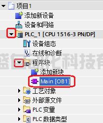 10.接下來(lái)我們開始編程:依次點(diǎn)擊軟件界面左側(cè)的項(xiàng)目樹中的“PLC_1[CPU 1516-3PN/DP]”、“程序塊”左側(cè)的小箭頭展開結(jié)構(gòu),再雙擊“Main[OB1]”打開主程序:
