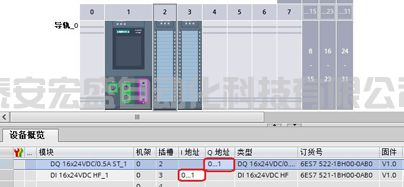 8.設(shè)備組態(tài)至此已經(jīng)完成,在項(xiàng)目視圖下方的“設(shè)備概覽”中,我們可以查看到系統(tǒng)默認(rèn)分配的數(shù)字量輸出地址是QB0~QB1,數(shù)字量輸入的地址是IB0~IB1: