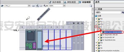 7.現(xiàn)在我們?cè)俨迦胍粋€(gè)DI模塊:在“設(shè)備視圖”右側(cè)的產(chǎn)品目錄中,依次點(diǎn)擊“DI”、“DI 16*24VDC HF”左側(cè)的小箭頭展開項(xiàng)目樹,然后用鼠標(biāo)點(diǎn)中訂貨號(hào)“6ES7 521-1BH00-0AB0”,按住鼠標(biāo)左鍵不放,將DI模塊拖拽到3號(hào)槽位上,松開鼠標(biāo):