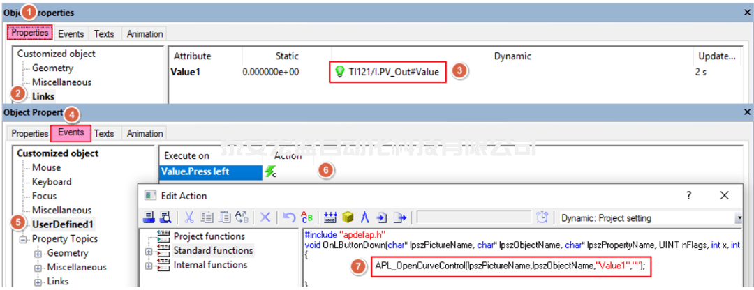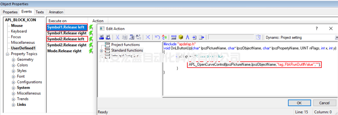 以 MonAnL 為例,APL 自帶功能塊圖標(biāo)之所以支持 AOTC 功能,是因為塊圖標(biāo)中“ Event→UserDefined1→Value1.Release left”存在腳本“APL_OpenCurveControl”,當(dāng)按住 Ctrl 鍵的同時點擊塊圖標(biāo)中對應(yīng)模擬量值時,會執(zhí)行以上腳本函數(shù)。