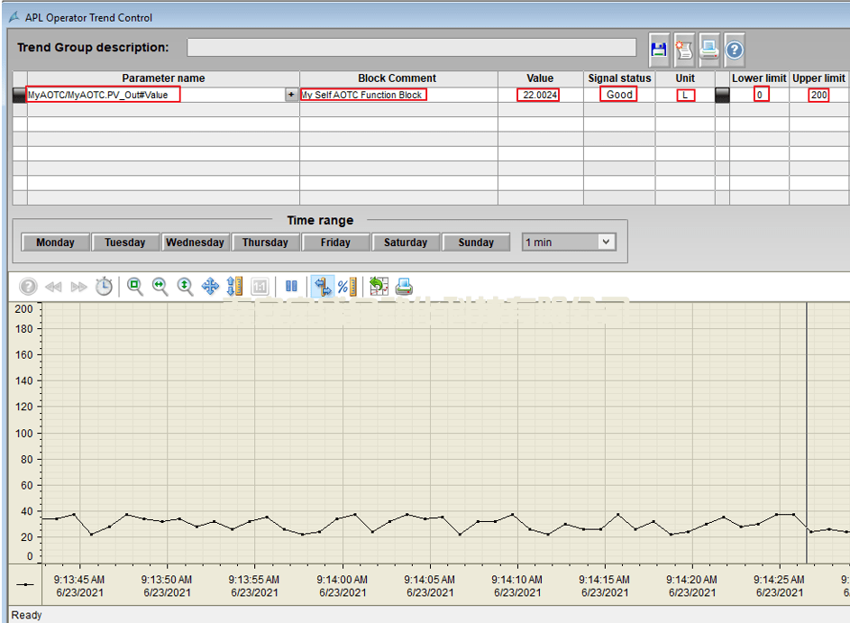 同添加模擬量到 AOTC 控件類似,按住 Ctrl鍵+左鍵單擊對應(yīng)圖標(biāo),比如在 MotL 塊圖標(biāo)上執(zhí)行了以上動作,則會將 FbkRunOut.Value 添加到新打開(或已經(jīng)打開的)AOTC 控件窗口。其原理和添加模擬量顯示相似,如下圖所示: