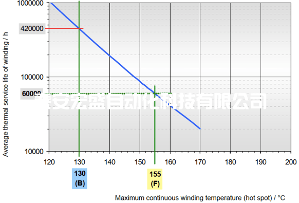 繞組發(fā)熱是影響繞組絕緣壽命的主要因素,從圖三我們可以看到電機繞組溫度和絕緣壽命之間的關(guān)系。溫度每升高10度,繞組絕緣壽命大約減半。