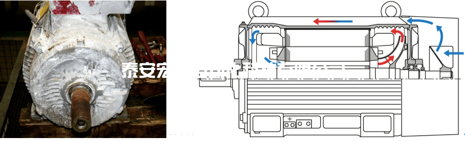 自冷扇電機用于調(diào)速運行時,低速大轉(zhuǎn)矩長時間運行,散熱風(fēng)量不足(如右圖)