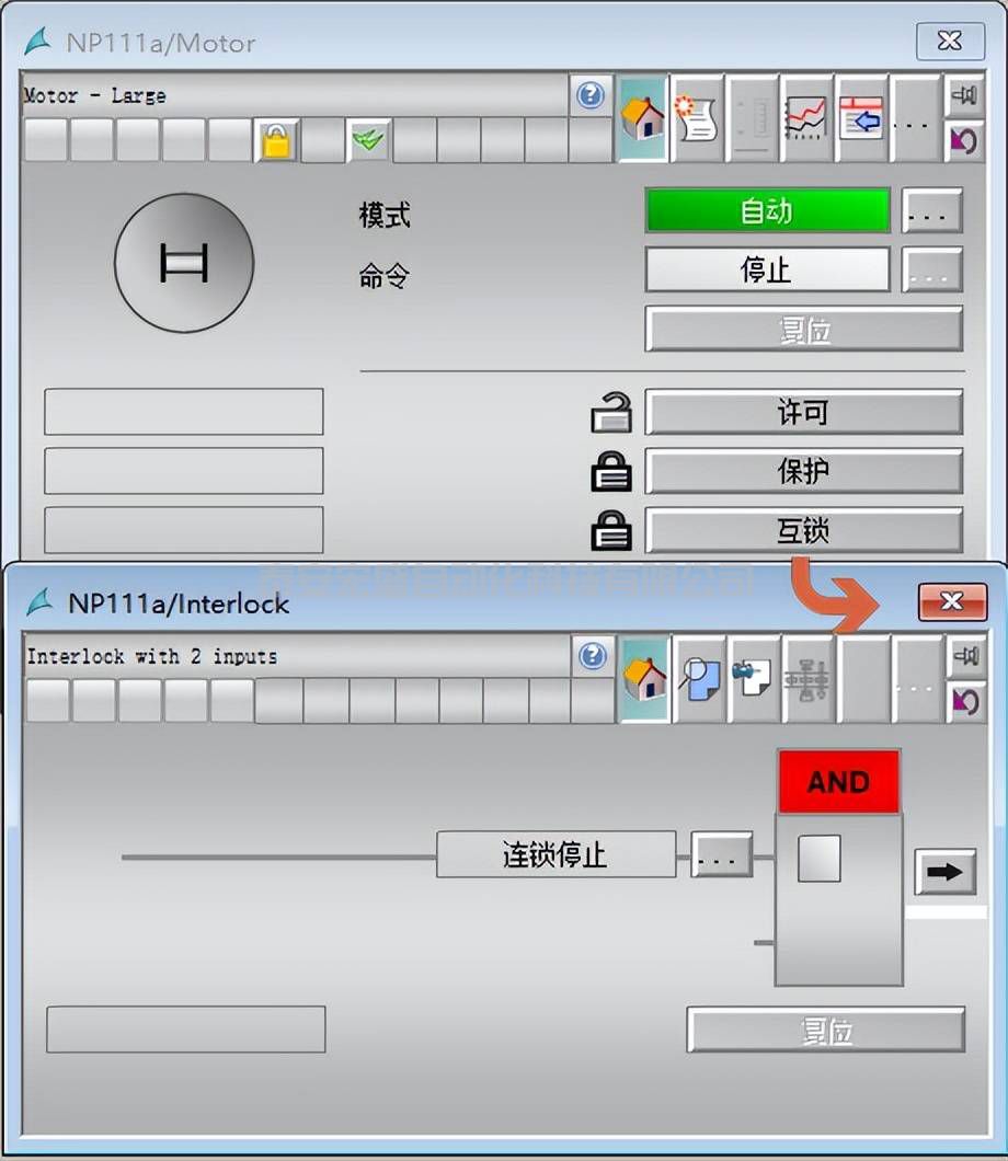 如果只是簡單的應(yīng)用,其實(shí)我們只需要復(fù)制模板后連接運(yùn)行信號(hào)和控制命令就完成了下位機(jī)程序組態(tài)。執(zhí)行CFC和OS編譯后,在上位機(jī)上就會(huì)自動(dòng)創(chuàng)建了對(duì)應(yīng)的塊圖標(biāo)和面板。把對(duì)應(yīng)的塊圖標(biāo)放置到流程圖中對(duì)應(yīng)的位置,就這么簡單的完成了上下位的組態(tài)。如果電機(jī)還涉及到啟動(dòng)允許、連鎖保護(hù),模板中也提供了三種連鎖,并且擴(kuò)展到了Interlock功能塊。借助于Interlock功能塊還能在電機(jī)面板中查看連鎖狀態(tài)、跳轉(zhuǎn)到連鎖面板旁通連鎖信號(hào)。