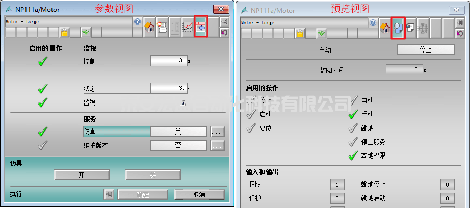 電機(jī)面板不止提供簡單的啟停和連鎖控制,還可以在參數(shù)面板設(shè)置監(jiān)視時(shí)間、仿真模式、維護(hù)發(fā)布等,另外預(yù)覽值視圖可以查看當(dāng)前模式和狀態(tài)、監(jiān)視時(shí)間、哪些操作可以啟用、關(guān)鍵參數(shù)的輸入和輸出值等功能。