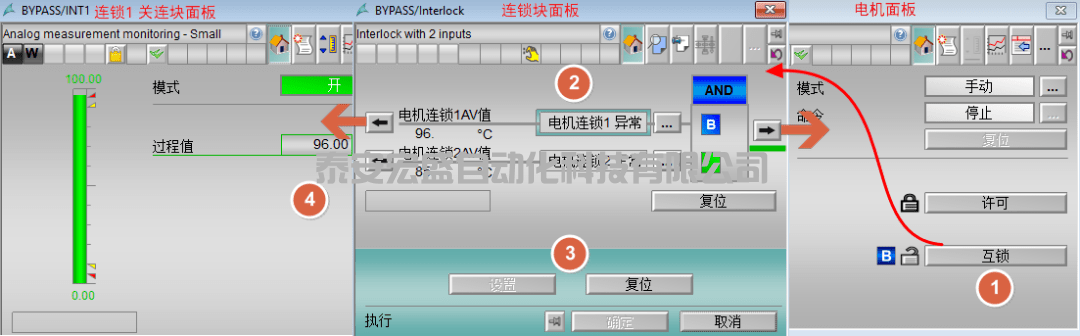 對(duì)于OS側(cè),則只需執(zhí)行OS編譯,互鎖塊可不創(chuàng)建塊圖表,通過工藝塊面板中的互鎖按鈕跳轉(zhuǎn)即可。在互鎖面板中可詳細(xì)看到各連鎖是否正常,對(duì)于異常信號(hào)可進(jìn)行旁路操作。而且可從互鎖面板跳轉(zhuǎn)回工藝塊或連鎖管腳所互連塊的面板。