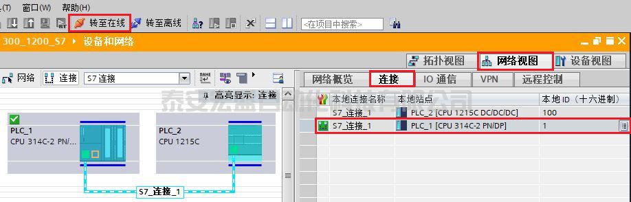 (1)配置完網(wǎng)絡(luò)連接,分別對 S7-300 和 S7-1200 編譯保存并下載。下載完成后,可點(diǎn)擊"轉(zhuǎn)至在線"按鈕,在“網(wǎng)絡(luò)視圖”的“連接”選項(xiàng)卡中查看連接狀態(tài),如圖 14 所示,本地連接名稱“S7_連接_1”左側(cè)有綠色標(biāo)志,則表示組態(tài)的連接已經(jīng)成功建立。