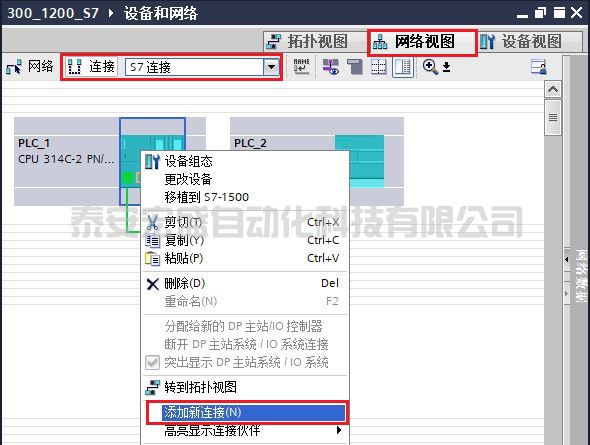 (1)打開 “網(wǎng)絡(luò)視圖” 配置網(wǎng)絡(luò),首先點(diǎn)中左上角的“連接”圖標(biāo),選擇“S7 連接”,然后選中 S7-300 CPU,右鍵選擇“添加新連接”添加新的連接,如圖 7 所示。