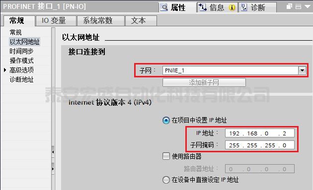 在 “設(shè)備視圖”中點(diǎn)擊 CPU 上代表 PROFINET 通信口的綠色小方塊,在下方會出現(xiàn) PROFINET 接口的屬性,在 “以太網(wǎng)地址” 下分配 IP 地址為 192.168.0.2 ,子網(wǎng)掩碼為 255.255.255.0,如圖 3 所示。