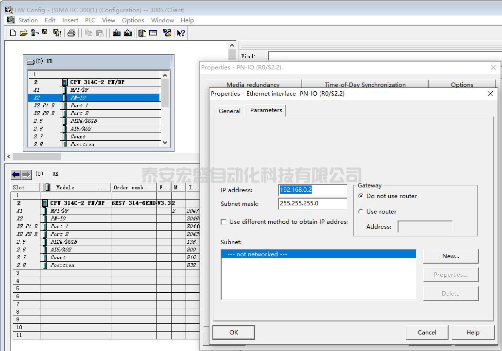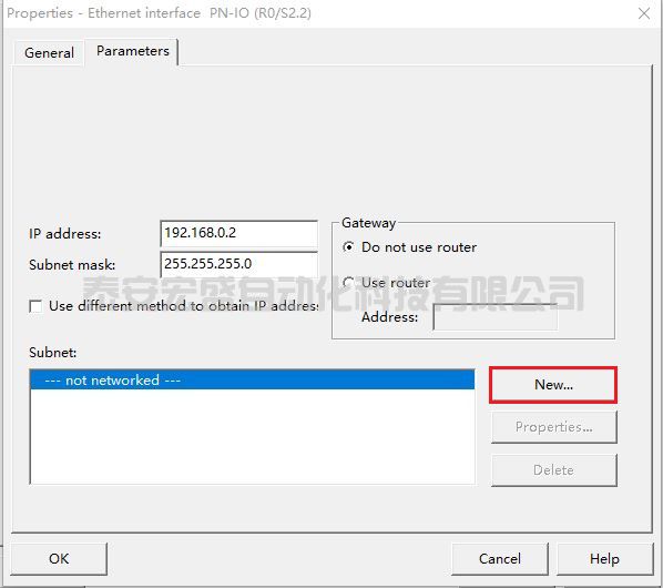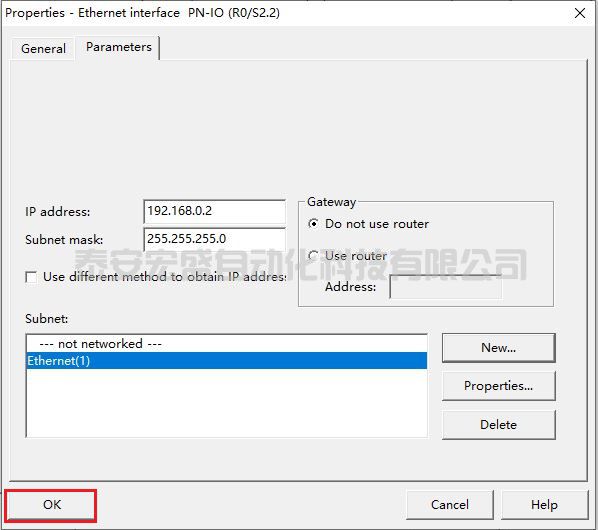 (7) 在彈出的“ Properties-Ethernet interface PN-IO”對話框的“ Parmeters”選項(xiàng)卡中為以太網(wǎng)接口設(shè)置 IP 地址192.168.0.2 和子網(wǎng)掩碼 255.255.255.0,如圖 60 所示。