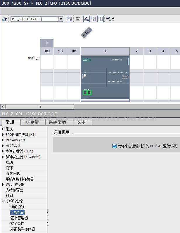 點(diǎn)開作為 S7 服務(wù)器的 S7-1200 CPU 的設(shè)備組態(tài),“屬性->常規(guī)->防護(hù)與安全”(V14 及以前是“屬性->常規(guī)->保護(hù)”)里“連接機(jī)制”一項(xiàng)需要勾選“允許來自遠(yuǎn)程對象的 PUT/GET 通信訪問”(V14 及以前是“允許從遠(yuǎn)程伙伴(PLC\HMI\OPC\...)使用 PUT/GET 通信訪問”),如圖 99 所示: