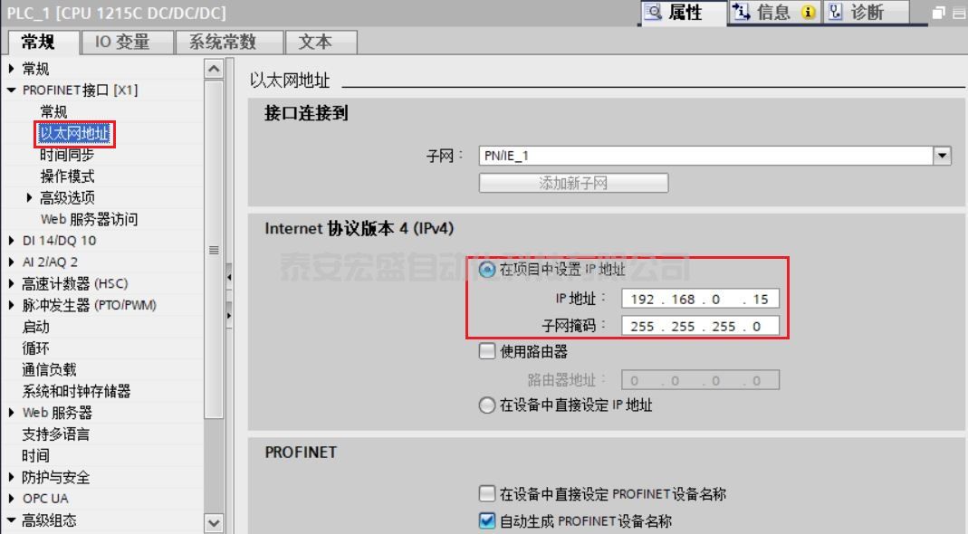 在 “設備視圖”中點擊 CPU 上代表 PROFINET 通信口的綠色小方塊,在下方會出現(xiàn) PROFINET 接口的屬性,在 “以太網地址” 下分配 IP 地址為 192.168.0.15 ,子網掩碼為 255.255.255.0,如圖 3 所示。