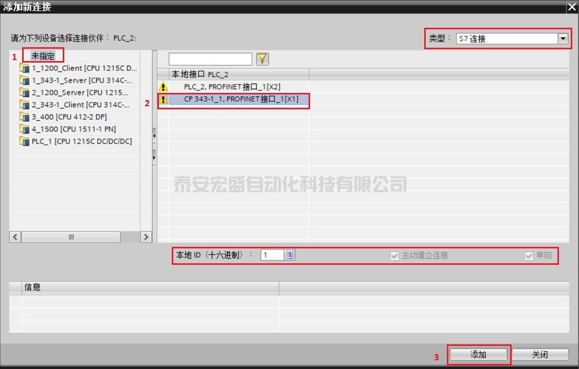 ② 在連接列表里選擇未指定,并確認本地接口,確認連接類型為 S7 連接。S7-300 側因做 S7 單邊通信客戶端,確認 S7 連接屬性為主動建立連接和單向,最后點擊添加,如圖 9 所示。