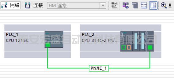 在 “項目樹”>“設備和網絡” >“網絡視圖” 視圖下,創(chuàng)建兩個設備的連接。用鼠標點中 S7-1200 上的PROFINET通信口的綠色小方框,然后拖拽出一條線,到另外一個 CP343-1 上的 PROFINET 通信口上,松開鼠標,PN/IE_1 的子網連接就建立起來了,如圖 7 所示。