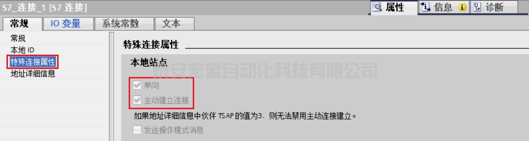 ② 特殊連接屬性內,確認客戶端 S7 單邊連接參數(shù):“單向”、“主動建立連接”勾選,如圖 14 所示。