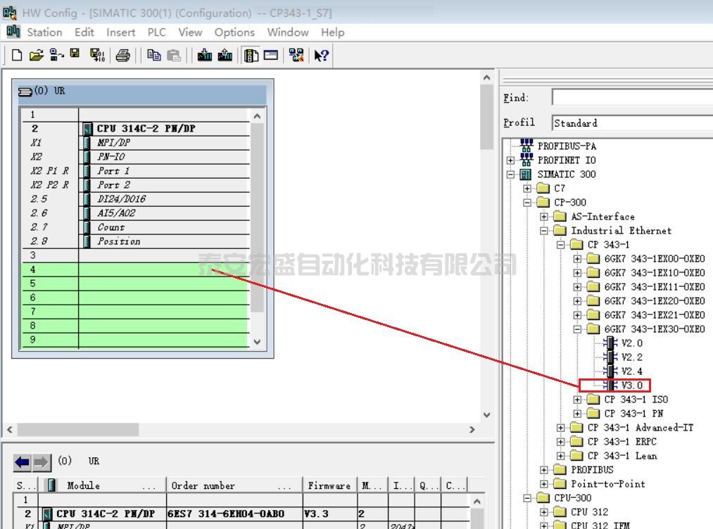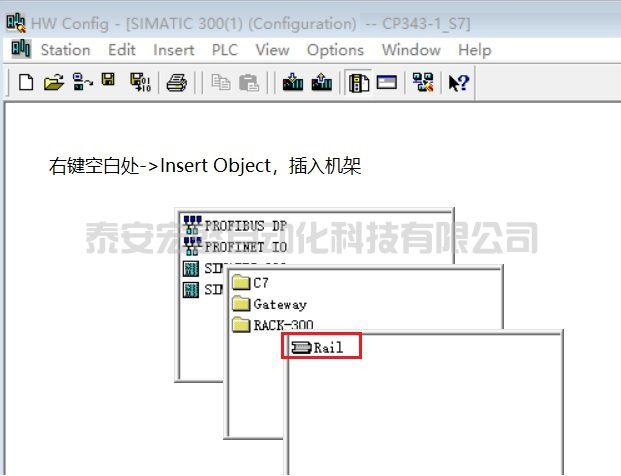 4.添加 S7-300 CPU 和 CP343-1 硬件并命名 PLC