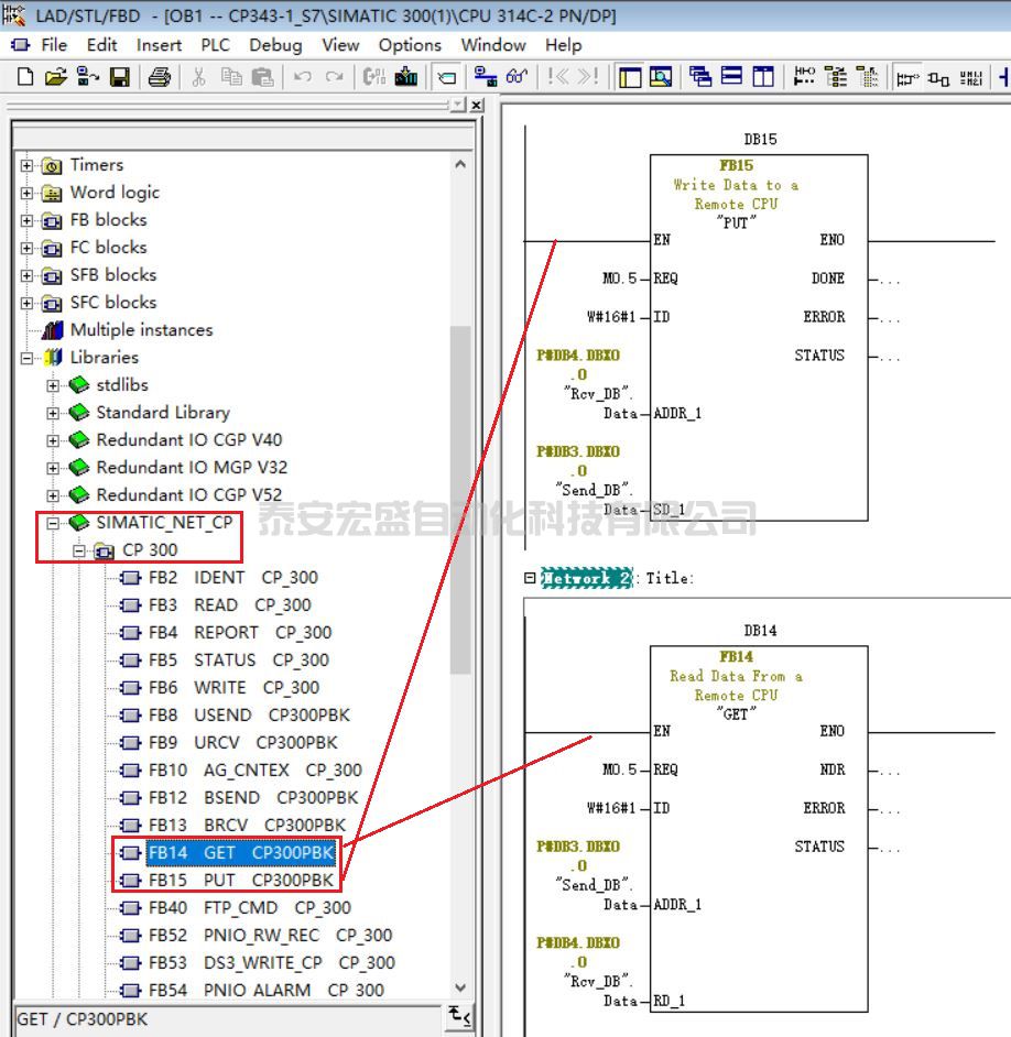 ② 在 OB1 中,從"Libraries">"SIMATIC_NET_CP">"CP 300"下,調用 FB15 "PUT"、FB14 "GET" 通信指令。程序見圖 40。