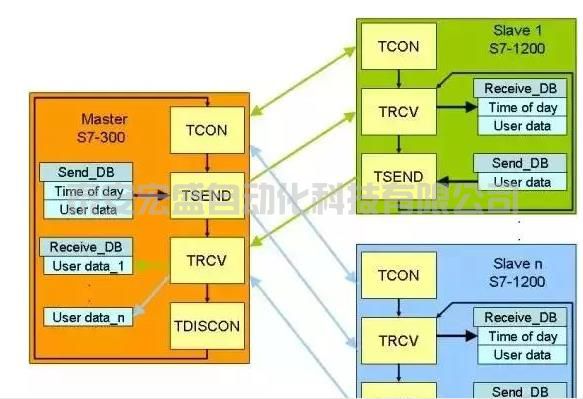 主站和每個(gè)從站都有一個(gè)發(fā)送和一個(gè)接收數(shù)據(jù)塊(Send_DB和Receive_DB)。通過(guò)TCON塊,主站將一個(gè)TCP/IP連接請(qǐng)求發(fā)送到第一個(gè)從站。要確認(rèn)連接已建立,通信對(duì)端也要執(zhí)行TCON塊。當(dāng)存在同步作業(yè)時(shí),主站讀取系統(tǒng)時(shí)間,并通過(guò)TSEND通信塊將此時(shí)間和用戶數(shù)據(jù)發(fā)送到從站。