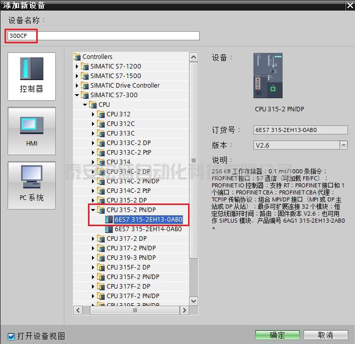 然后進入 “項目視圖”,在“項目樹” 下雙擊 “添加新設備”,在對話框中選擇所使用的 S7-300 CPU 添加到機架上,命名為 300CP,如圖2所示。