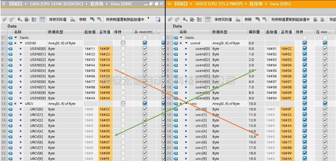 ② S7-300 CPU將通訊數(shù)據(jù)區(qū) DB5 塊中的 10 個字節(jié)的數(shù)據(jù)發(fā)送到 S7-1200 CPU的接收數(shù)據(jù)區(qū) DB4 塊中。