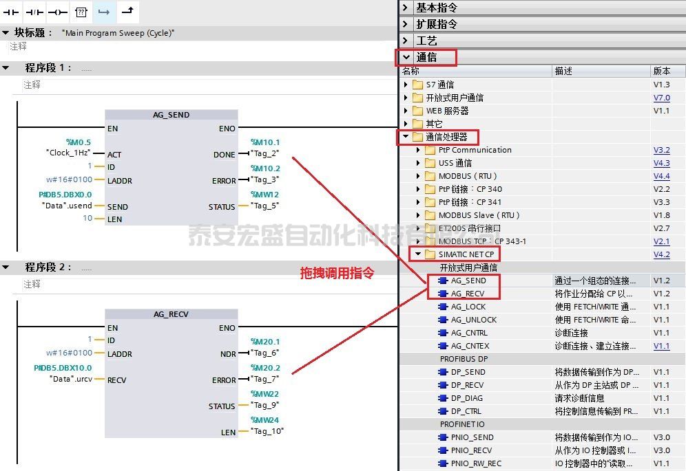 在OB1中,從“指令”>“通信 ”>“通信處理器 ”>“SIMATIC NET CP”下,調用“AG_SEND” 、“AG_RECV ”通信指令。創(chuàng)建接收和發(fā)送數(shù)據(jù)塊 DB5,發(fā)送10字節(jié)數(shù)組,接收10字節(jié)數(shù)組, 如圖10所示。