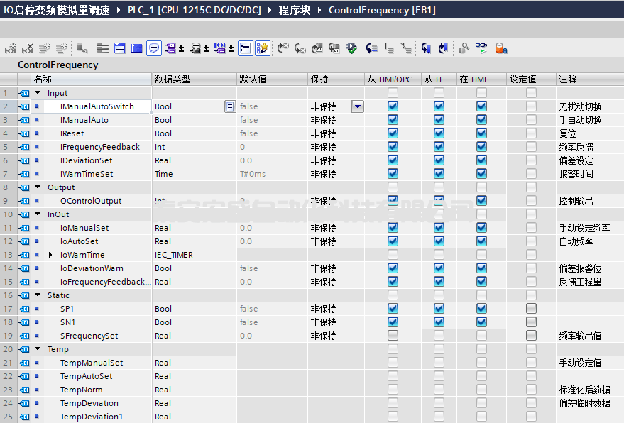 控制變頻器時(shí),有很多種方式,比如通信、模擬量、開關(guān)量等方式。而在現(xiàn)場PLC控制變頻器時(shí),可能會有手自動切換、頻率給定、頻率反饋、無擾動切換等功能需求。那么我們就可以利用S7-1200PLC的FB塊的功能,把上述功能進(jìn)行封裝。