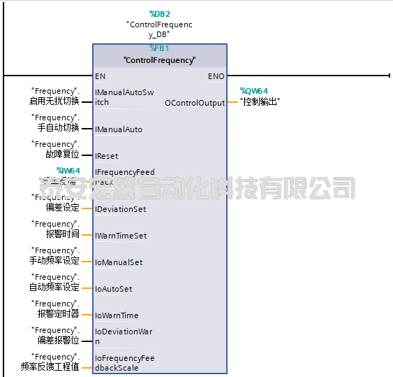 ②程序段2:當(dāng)HMI上的“手自動切換”按鈕FALSE時(shí),“手動設(shè)定頻率”生效,變頻器根據(jù)手動設(shè)定的頻率運(yùn)行;當(dāng)HMI上的“手自動切換”按鈕TRUE時(shí),變頻器根據(jù)自動設(shè)定的頻率運(yùn)行(可以根據(jù)現(xiàn)場的PID運(yùn)算等參數(shù)給定)。使用LIMIT指令是為了限制給定的頻率值在0-50HZ之間,假如“手動設(shè)定頻率”或者“自動頻率”的值小于0或者大于50,“#TempManualSet”和“#TempAutoSet”會自動限制在0-50之間。小于0則用0替代,大于50則用50替代。