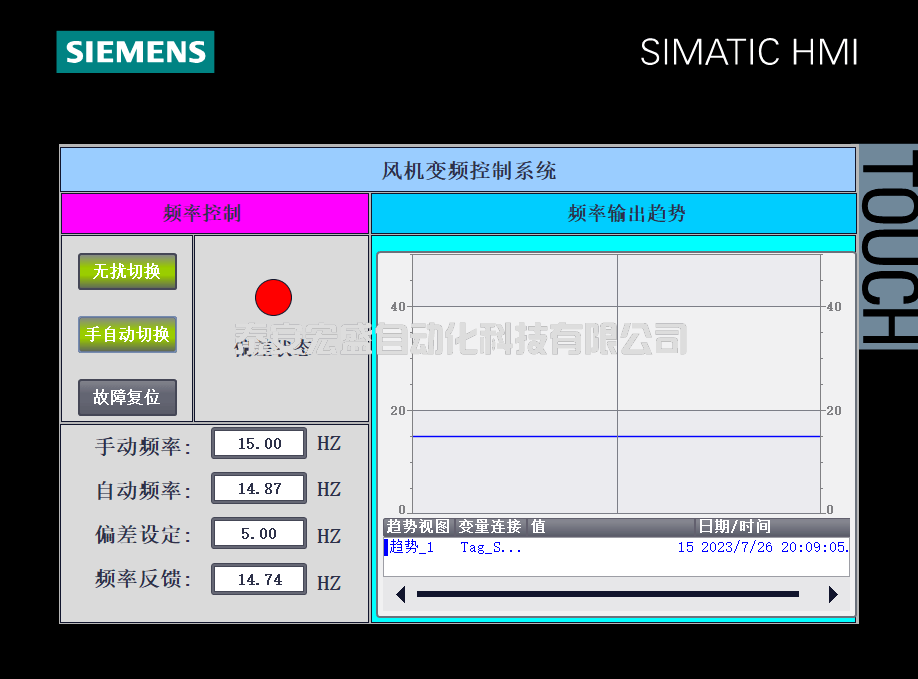 ②如圖3所示:HMI上“無擾切換”切換模式啟用;“手自動切換”為FALSE,代表的是手動模式;手動頻率給定的是15HZ,頻率輸出曲線一直是在15HZ。當(dāng)切換到自動模式,如圖4所示,頻率反饋的值給到自動頻率值,曲線可以看出頻率輸出沒有產(chǎn)生擾動。