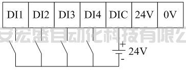 V20變頻器共有4個光電隔離的數(shù)字量輸入,包括DI1,DI2,DI3和DI4。數(shù)字量輸入可采用變頻器內(nèi)部24V電源供電,也可采用外接24V電源供電;可以接成PNP接法,也可以接成NPN接法。