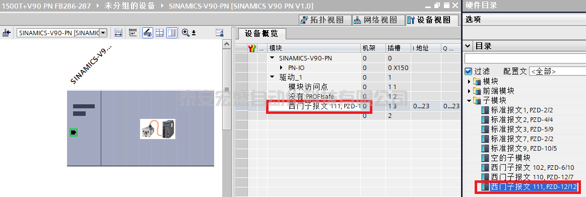 2. 創(chuàng)建項目后添加PLC后,在網(wǎng)絡(luò)視圖中將"其他現(xiàn)場設(shè)備"下的V90 PN拖到網(wǎng)絡(luò)中