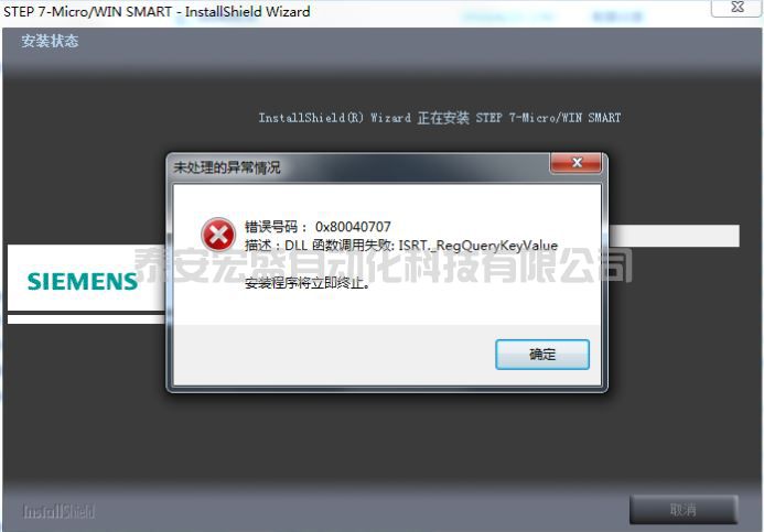 S7-200 SMART安裝中止或者報(bào)告DLL函數(shù)調(diào)用失敗如圖2所示: