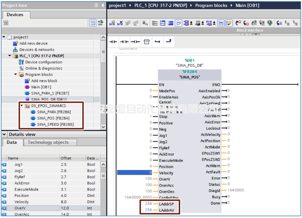 4.在OB1中調(diào)用SINA_POS(FB284) 實(shí)現(xiàn)S120的基本定位控制。