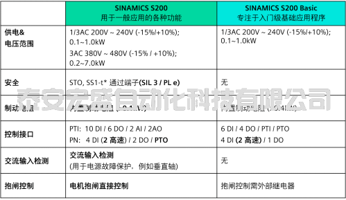 SINAMICS S200伺服驅(qū)動(dòng)器分為Basic版和標(biāo)準(zhǔn)版,可滿足各種應(yīng)用需求。關(guān)于供電及電壓范圍、安全功能、制動(dòng)電阻、控制接口、交流輸入檢測(cè)及抱閘控制幾方面的說明,請(qǐng)參看表2-1。