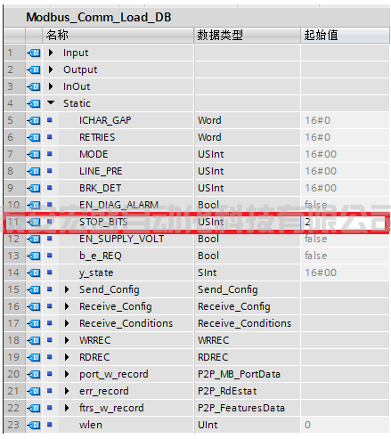 Modbus_Commload 指令的背景 DB 里 Static 修改 STOP_BITS停止位數(shù)值為 2(默認(rèn)值=1)