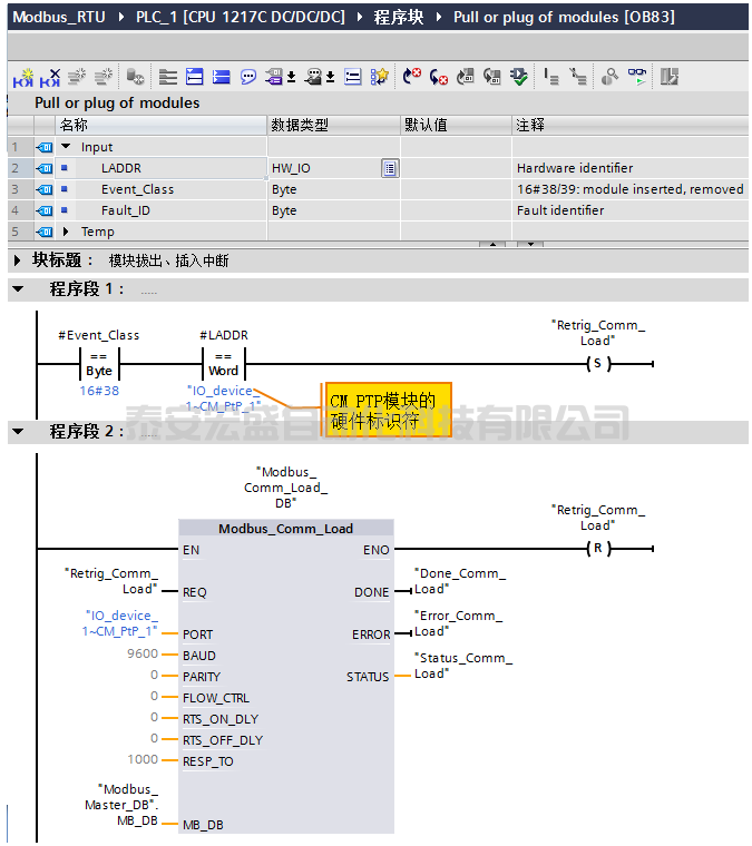 本例中Modbus RTU主站模塊安裝在分布式IO站點上,因此程序中需要考慮分布式IO站點故障、CM PTP 模塊插拔模塊等故障。分布式IO站點中插出、拔入模塊時,操作系統(tǒng)都會調(diào)用一次OB83。通過OB83接口區(qū)的輸入變量“16#Event_Class”判斷故障的模塊和類型:事件類型16#39表示模塊被拔出,事件類型16#38表示模塊被插入。CM PTP 模塊被重新插入的時候,需要在中斷OB83中調(diào)用Modbus_Comm_Load 指令對通信模塊進(jìn)行重新組態(tài),如圖15所示。