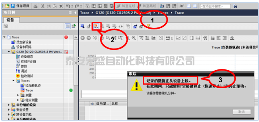 Startdrive 的Trace組態(tài)配置保存在變頻器中,在Trace觸發(fā)記錄過(guò)程中,變頻器需要一值保持上電狀態(tài)。否則,記錄數(shù)據(jù)會(huì)丟失。