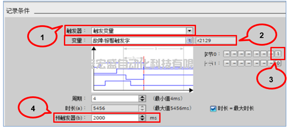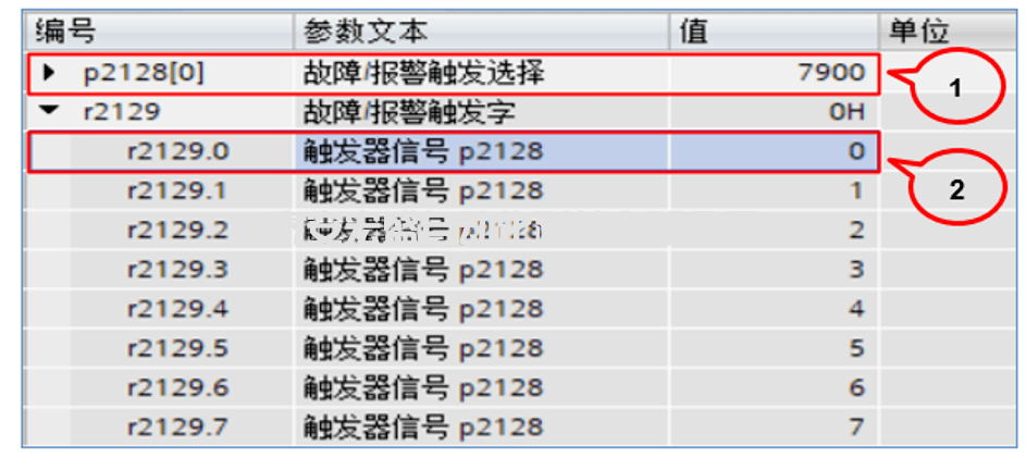 為記錄某個(gè)特定故障時(shí)變頻器的參數(shù)狀態(tài),我們可以設(shè)置特定的故障觸發(fā)模式。例如,我們記錄F07900堵轉(zhuǎn)故障時(shí)變頻器的運(yùn)行狀態(tài),設(shè)置p2128.0=7900,一旦觸發(fā) F07900,則 r2129.0 置 1,如下圖1-4所示。