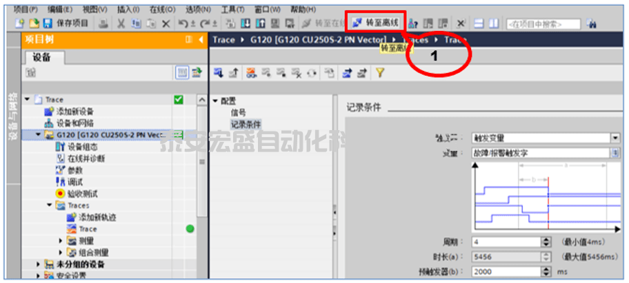 激活Trace記錄功能后,選擇“轉(zhuǎn)至離線”。之后等待故障發(fā)生,故障發(fā)生時(shí)數(shù)據(jù)會(huì)記錄到變頻器中。