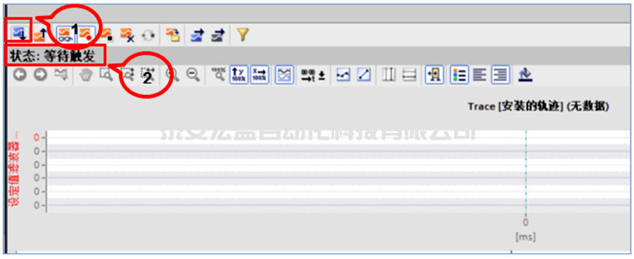 點(diǎn)擊按鈕 “在設(shè)備上安裝軌跡”,變頻器會(huì)裝載Trace設(shè)置并自動(dòng)激活Trace,在狀態(tài)處顯示: “等待觸發(fā)”,如下圖1-6所示。
