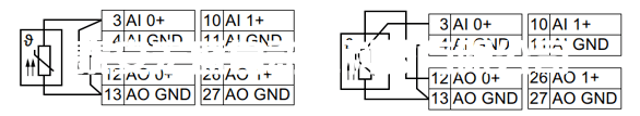 根據(jù)Pt100溫度傳感器接線原理,Pt100傳感器需要占用G120XA的一個(gè)模擬量輸出端子和一個(gè)模擬量輸入端子,傳感器連接到模擬量輸入AI 0或AI 1,模擬量輸出AO 0或AO 1。