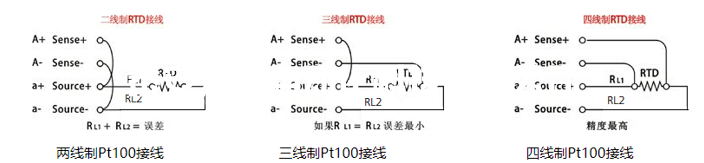 Pt100溫度傳感器接線原理,與熱電阻連接的檢測(cè)設(shè)備(顯示儀器儀表、CDS輸入、測(cè)溫模塊等)都有四個(gè)接線端子分別是:I+、I-,V+、V-。其中I+、I-端子給Pt100提供恒定電流,V+、V-是用來檢測(cè)熱電阻的電壓變化,通過電壓值的變化檢測(cè)溫度變化。三種接線方式如下圖所示: