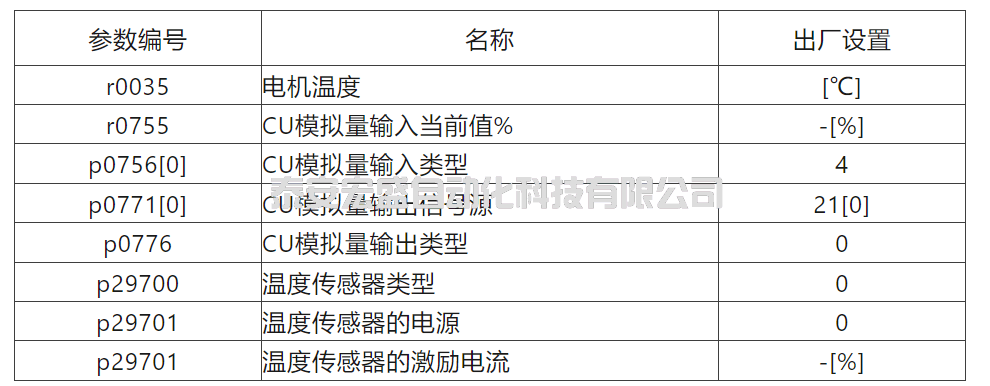 注:p29700(0~3)為串聯(lián)Pt100的數(shù)量。Pt100溫度傳感器測(cè)量使能后(p29700>0),p601設(shè)定值無效,r35讀取電機(jī)溫度值為Pt100溫度傳感器的測(cè)量值。若p29700=0,電機(jī)溫度傳感器可通過p601進(jìn)行選擇設(shè)置。