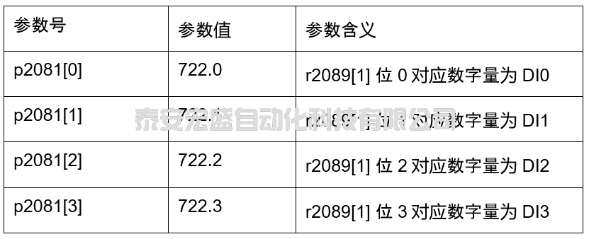 組合后的字對應的參數為r2089.1,按上述設置后,r2089.1 bit 0為DI0狀態(tài),以此 類推r2089.1 bit 3為DI3狀態(tài),最后設置p2051.2=2089.1。