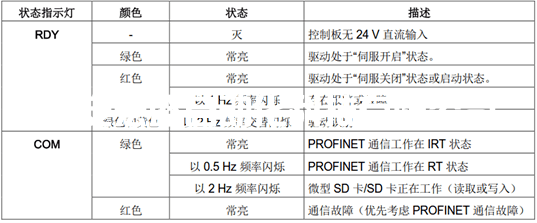 兩個(gè) LED 狀態(tài)指示燈(RDY 和 COM)可用來(lái)顯示驅(qū)動(dòng)的狀態(tài)。兩個(gè) LED 燈都為三色(綠色/紅色/黃色)。