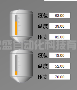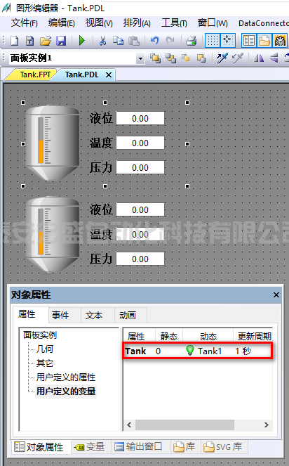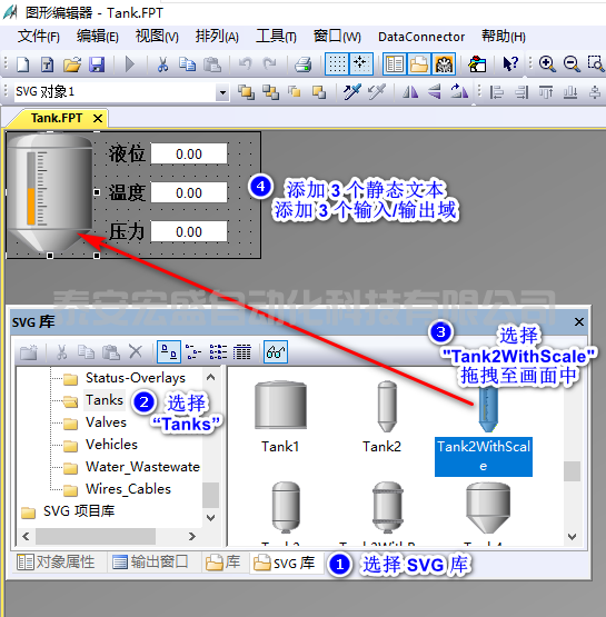 在畫面編輯器中點(diǎn)擊文件菜單選擇“新建面板類型”,并保存為“Tank.FPT”。設(shè)置尺寸為 230*115 。打開SVG 庫,找到 V2.0 中的“Tanks”,添加“Tank2WithScale”到面板類型中。然后添加 3 個靜態(tài)文本編輯好顯示文本。添加 3 個輸入/輸出域,命名為“輸入/輸出域1”、“輸入/輸出域2”、“輸入/輸出域3”,無需關(guān)聯(lián)變量。如圖 3 。