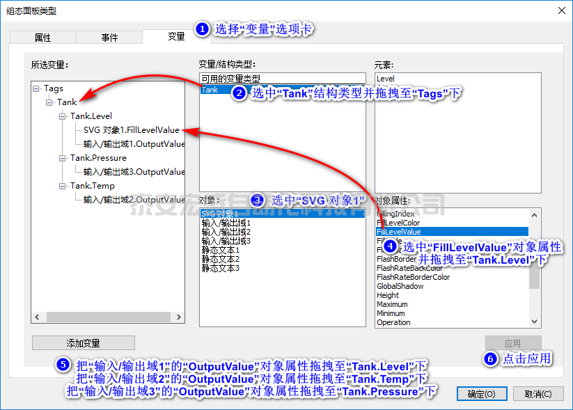 在組態(tài)面板類型對話框中選擇“變量”選項(xiàng)卡。將結(jié)構(gòu)類型“Tank”拖拽至左側(cè)的“Tags”下。然后分別把 SVG 對象1 的“FillLevelValue”對象屬性拖拽至“Tank.Level”下。把“輸入/輸出域1”的“OutputValue”對象屬性拖拽至“Tank.Level”下; 把“輸入/輸出域2”的“OutputValue”對象屬性拖拽至“Tank.Temp”下; 把“輸入/輸出域3”的“OutputValue”對象屬性拖拽至“Tank.Pressure”下,如圖 5 。
