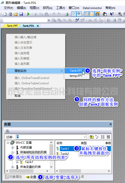 在屬性窗口中選擇“變量”選項(xiàng)卡,并選擇“所有結(jié)構(gòu)實(shí)例的列表”。在右側(cè)結(jié)構(gòu)變量列表中,通過鼠標(biāo)右鍵選擇“Tank1”后拖拽至畫面中,在彈出菜單中選擇“面板實(shí)例 > Tank.FPT”。用同樣方法創(chuàng)建Tank2 面板實(shí)例,如圖 7 。