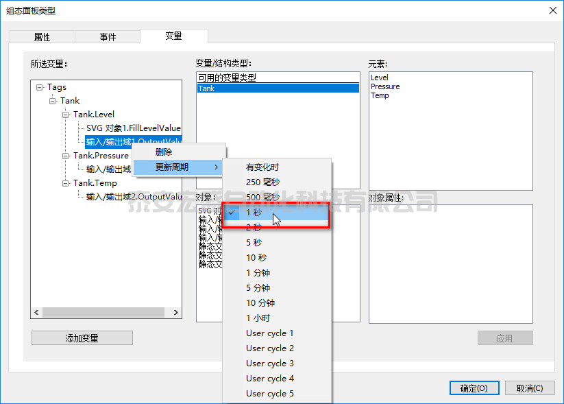 選擇更新周期??梢杂益I單擊每一個關(guān)聯(lián)了結(jié)構(gòu)變量元素的對象屬性設(shè)置更新周期。(建議選擇統(tǒng)一更新周期如: 1 秒)如圖 6 。