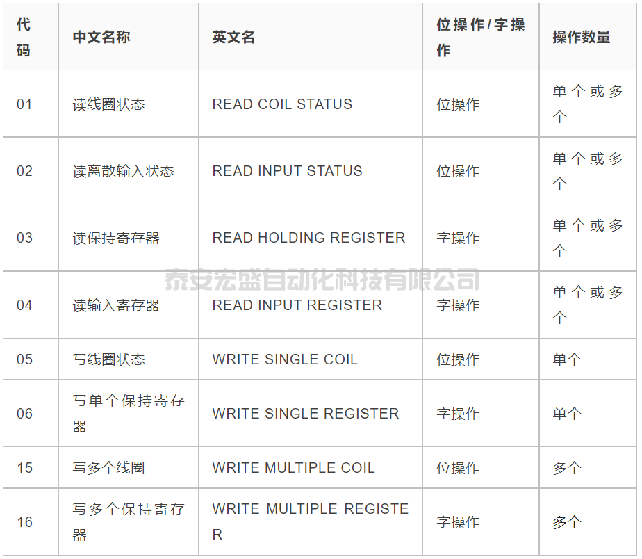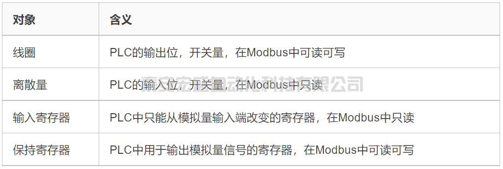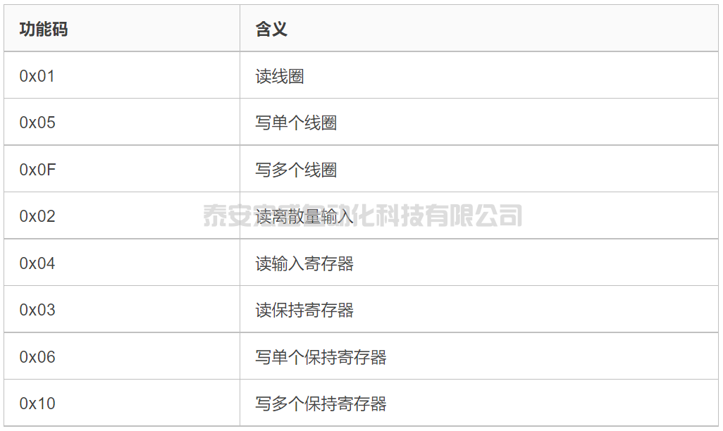 (1)功能碼:Modbus的操作對(duì)象有四種:線圈、離散輸入、保持寄存器、輸入寄存器。